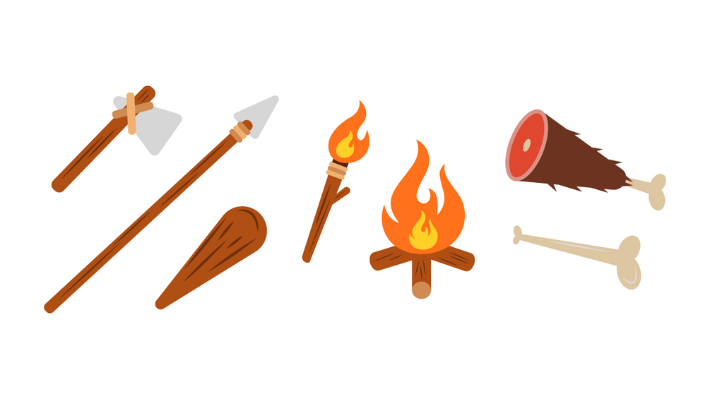 - A set of primitive tools: Stone Axe, Stone Spear, Wodden Club, Torch, Campfire, Bone and Piece of Meat